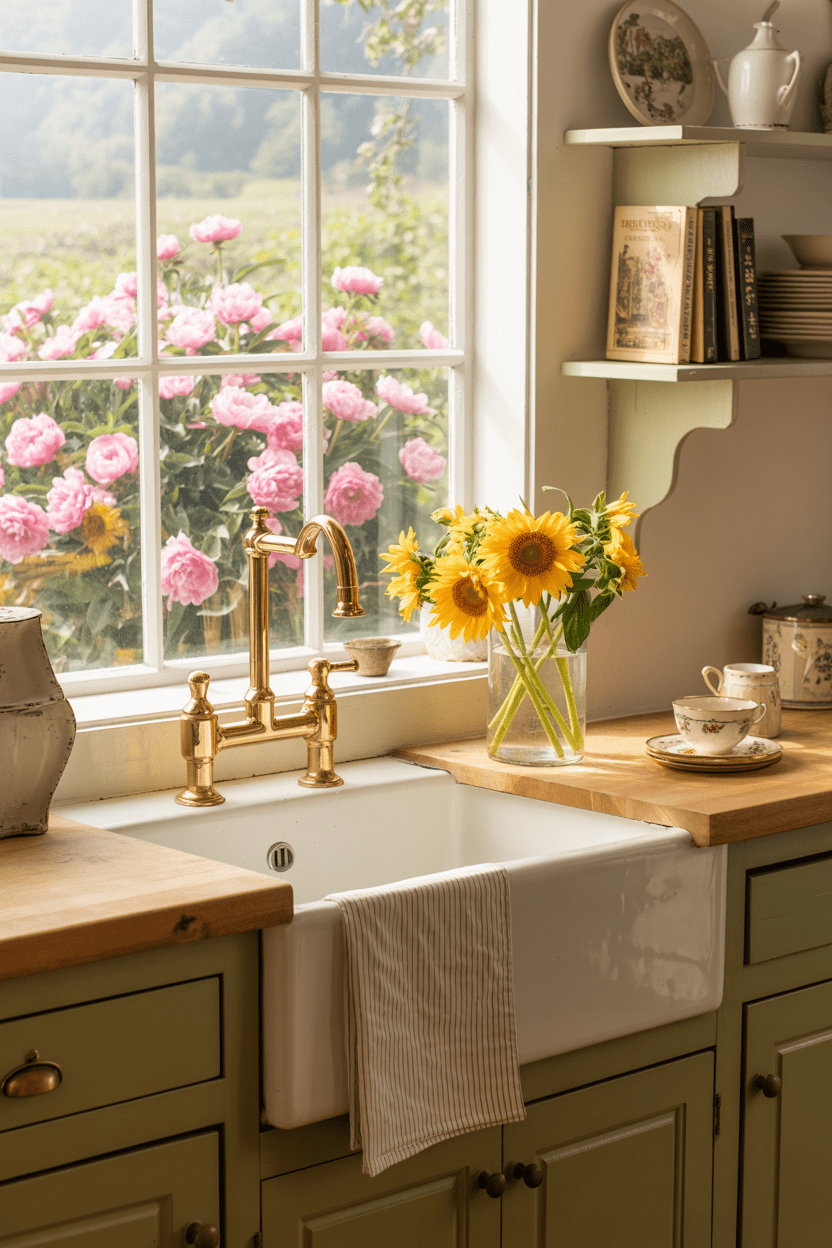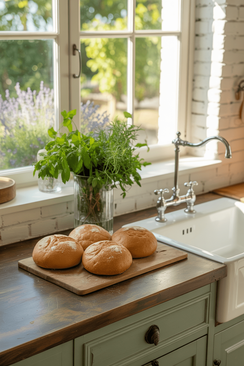 A classic white farmhouse sink pairs beautifully with any green kitchen, especially sage or olive tones. This combination creates a bright, welcoming focal point and adds timeless charm to your space. Complete the look with open shelves or vintage accents for added character.