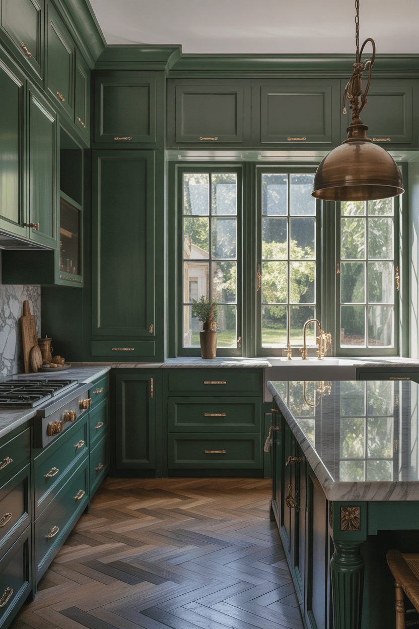 Deep green cabinets grounded by herringbone wood floors create a luxurious, textured look. This style works in larger kitchens where you want drama without sacrificing warmth. Accessorize with brass or black hardware for a polished finish.