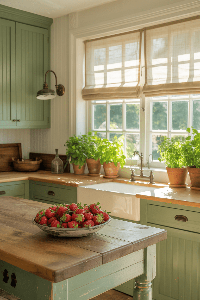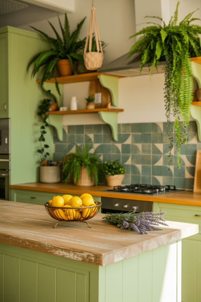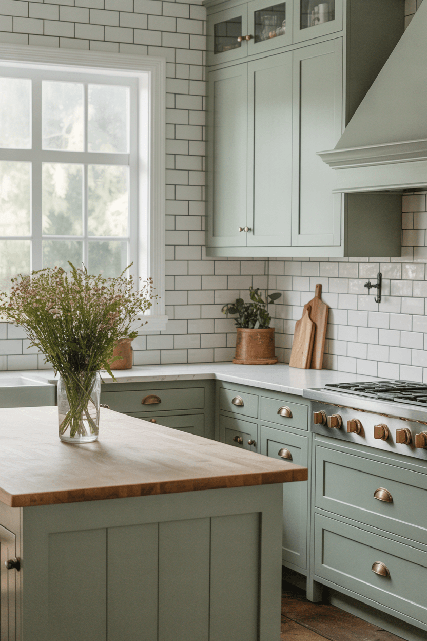 Sage green kitchens paired with butcher block countertops are cozy and inviting. The natural wood balances the softness of sage, creating a warm, approachable space. Add vintage accents or open shelving to enhance the farmhouse feel.