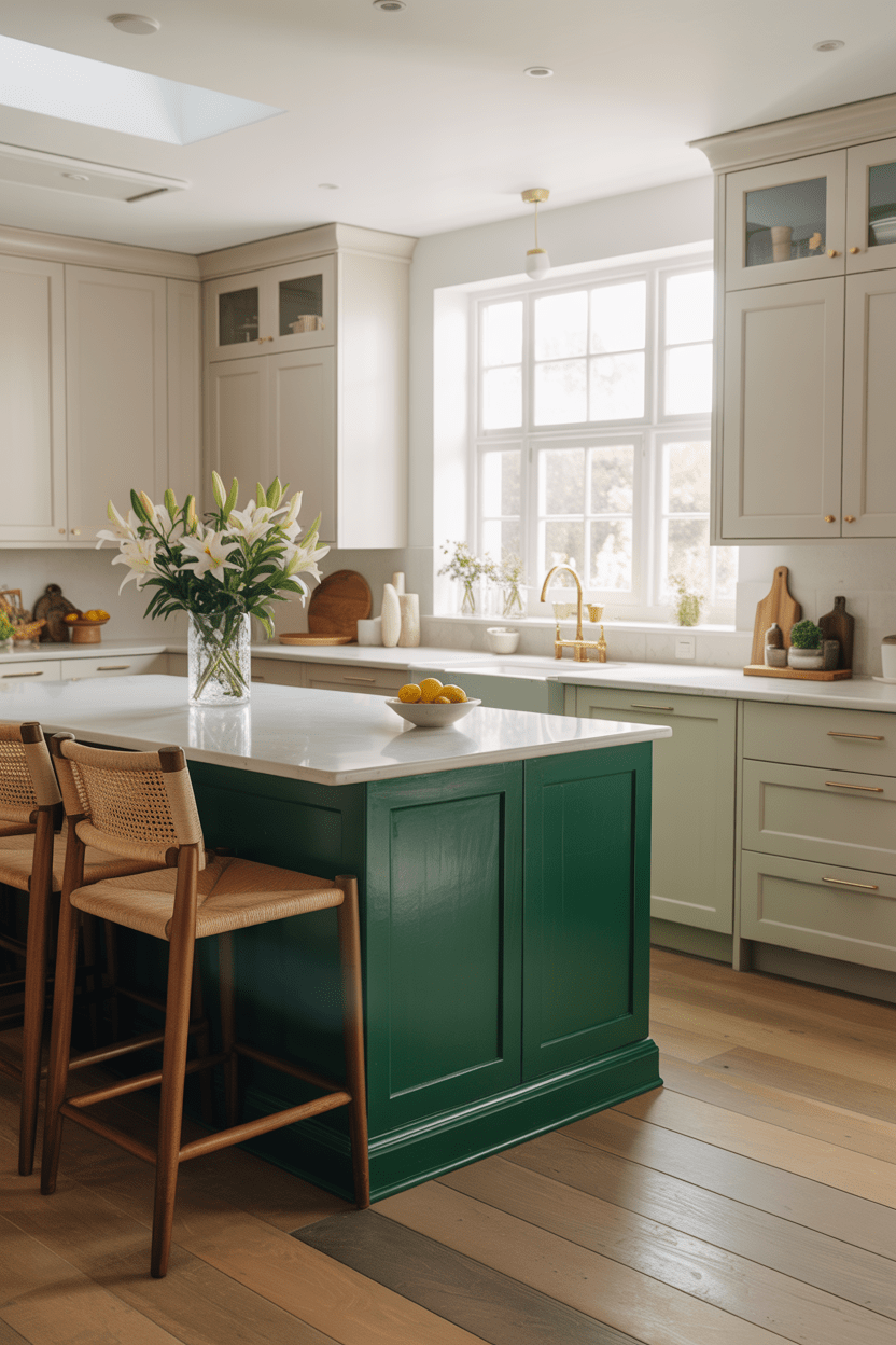 Create a stunning focal point in your kitchen with a bold green island that contrasts with neutral cabinetry and countertops. Add bar stools, pendant lighting, and decorative accents to make the island both functional and eye-catching. This design instantly elevates the space and brings a vibrant, Pinterest-worthy pop of green to your kitchen.