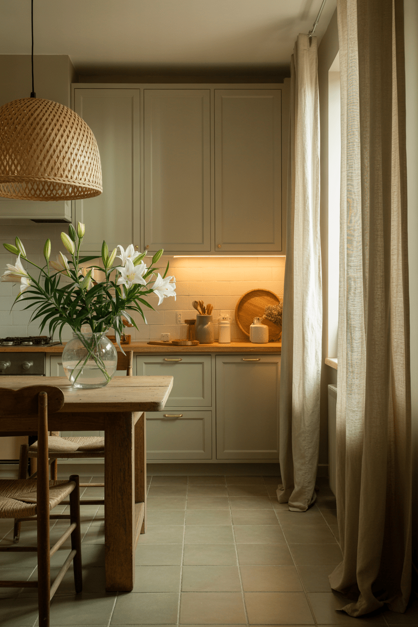 Soft sage kitchens feel calm and approachable. Adding woven or rattan lighting introduces texture and a natural, boho vibe. This combination works beautifully in cozy or cottage-style green kitchens.