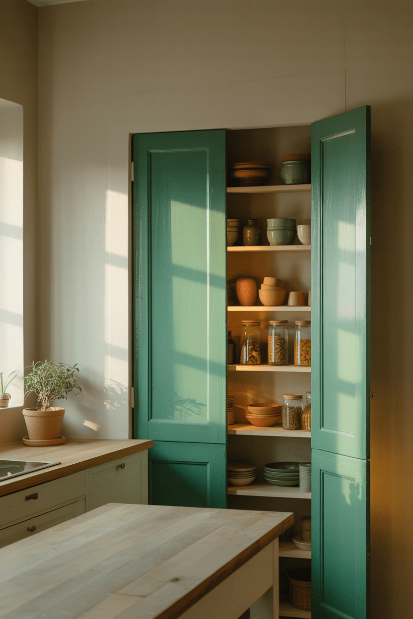 Even a small touch of green, like a painted pantry door, can transform a kitchen. This idea works especially well in otherwise neutral kitchens, adding a fresh pop of color without overwhelming the space.