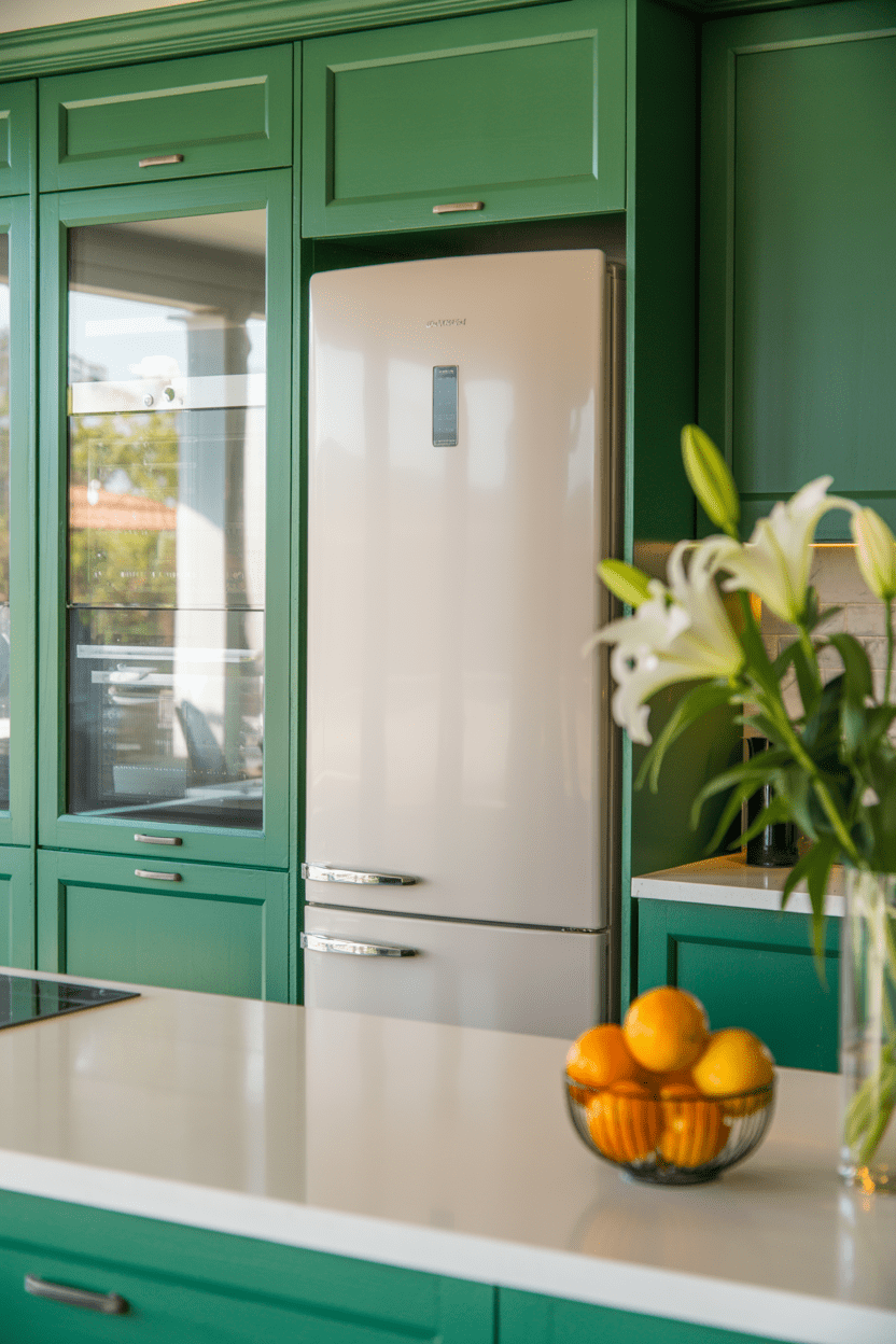 Pairing green kitchen cabinets with matte white appliances keeps the look modern and cohesive. This combination allows your green cabinetry to stand out while maintaining a clean, uncluttered feel.