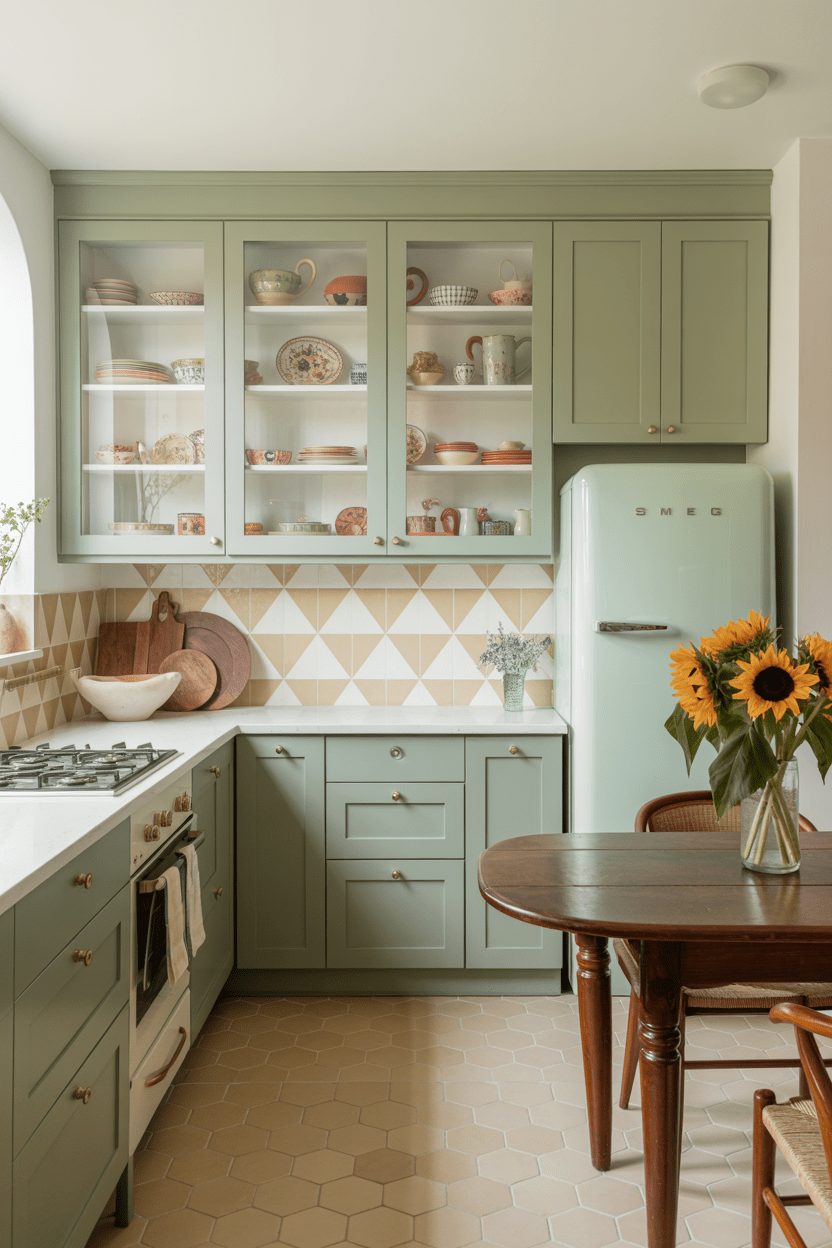 Sage green kitchen cabinets are timeless and calming. Introducing a patterned backsplash adds visual interest and personality to the space. Consider soft geometric tiles or subtle floral patterns to make your green kitchen feel cozy and curated.