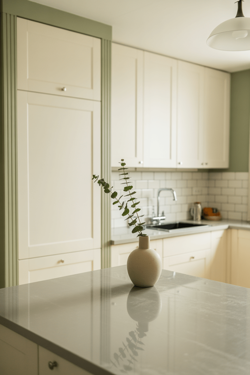 Mint green is soft, cheerful, and perfect for a fresh kitchen feel. Pairing mint green cabinets with white quartz countertops creates a clean, bright space that feels welcoming and timeless. This style works well in smaller kitchens that need an airy vibe.