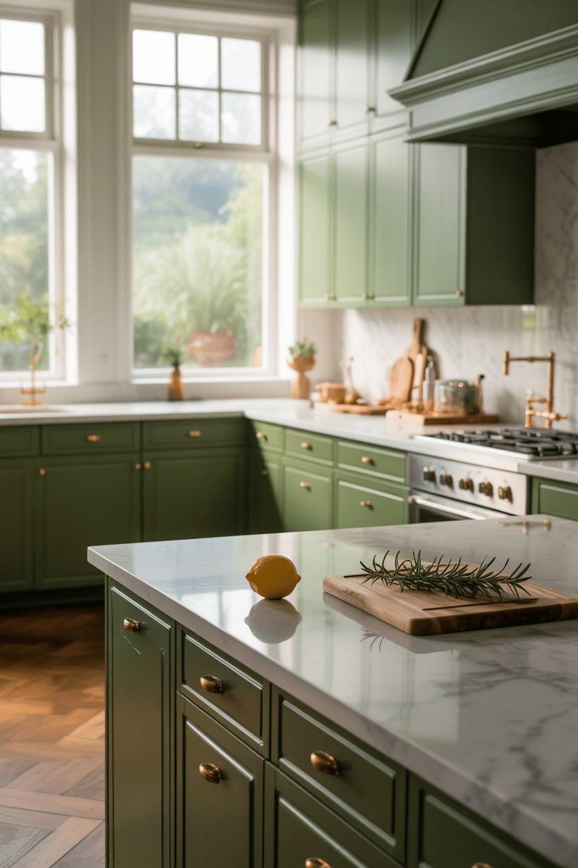 • Use contrasting accents like brass, black, or white to make green cabinetry pop.