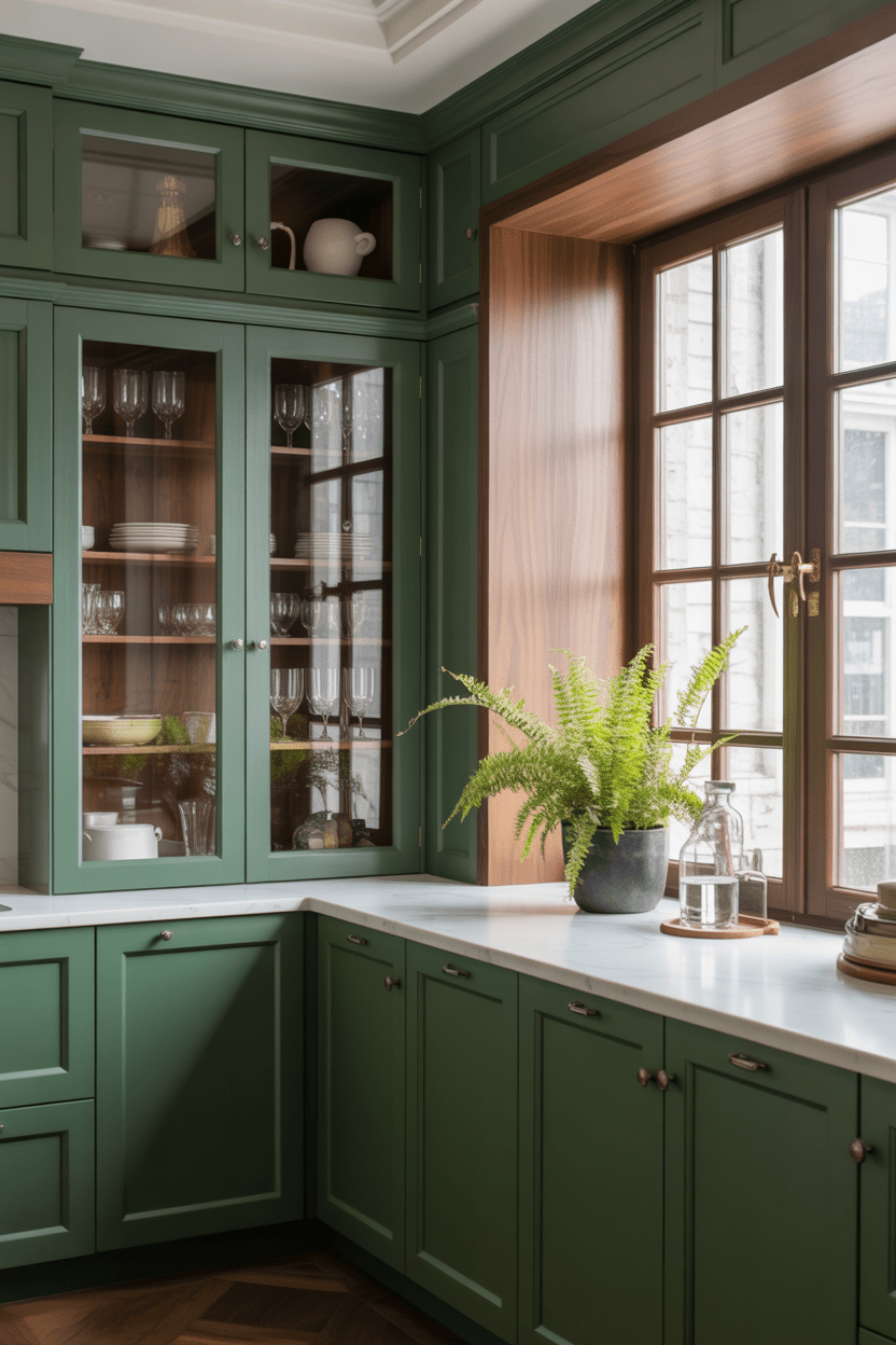 Forest green kitchen cabinets are rich and moody, and pairing them with glass-front doors adds depth and elegance. Use this style to showcase glassware or heirloom dishes, giving your green kitchen a luxurious and personalized touch.