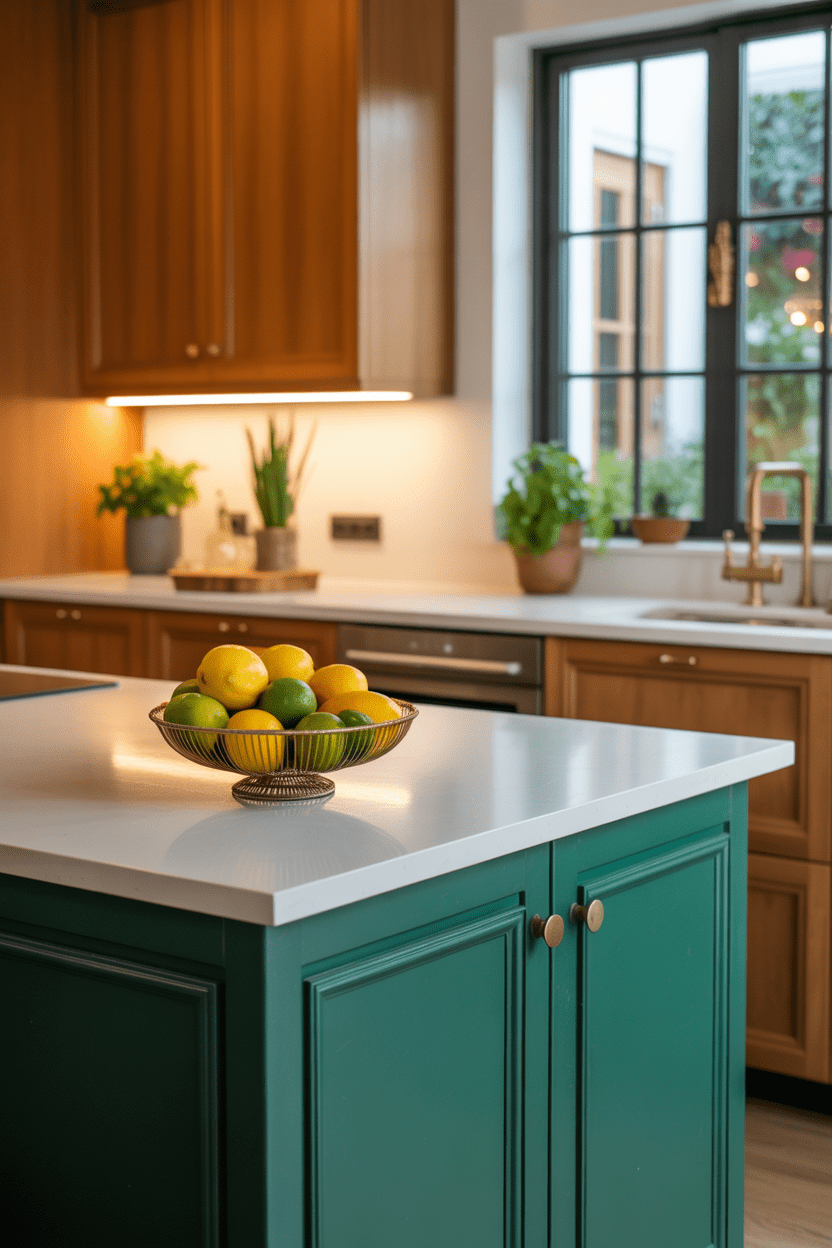 A green kitchen island serves as a bold focal point, especially when contrasted with natural wood cabinets. This combination brings warmth and texture while keeping the space visually dynamic. Finish the island with a marble or quartz countertop for added style.
