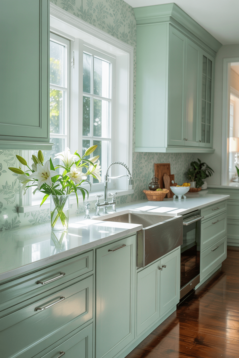 Pistachio green kitchens are playful yet sophisticated. Small brass pulls elevate the look, making the cabinets feel polished and intentional. Pair this green kitchen with soft neutrals or subtle patterns to keep it fresh and fun.