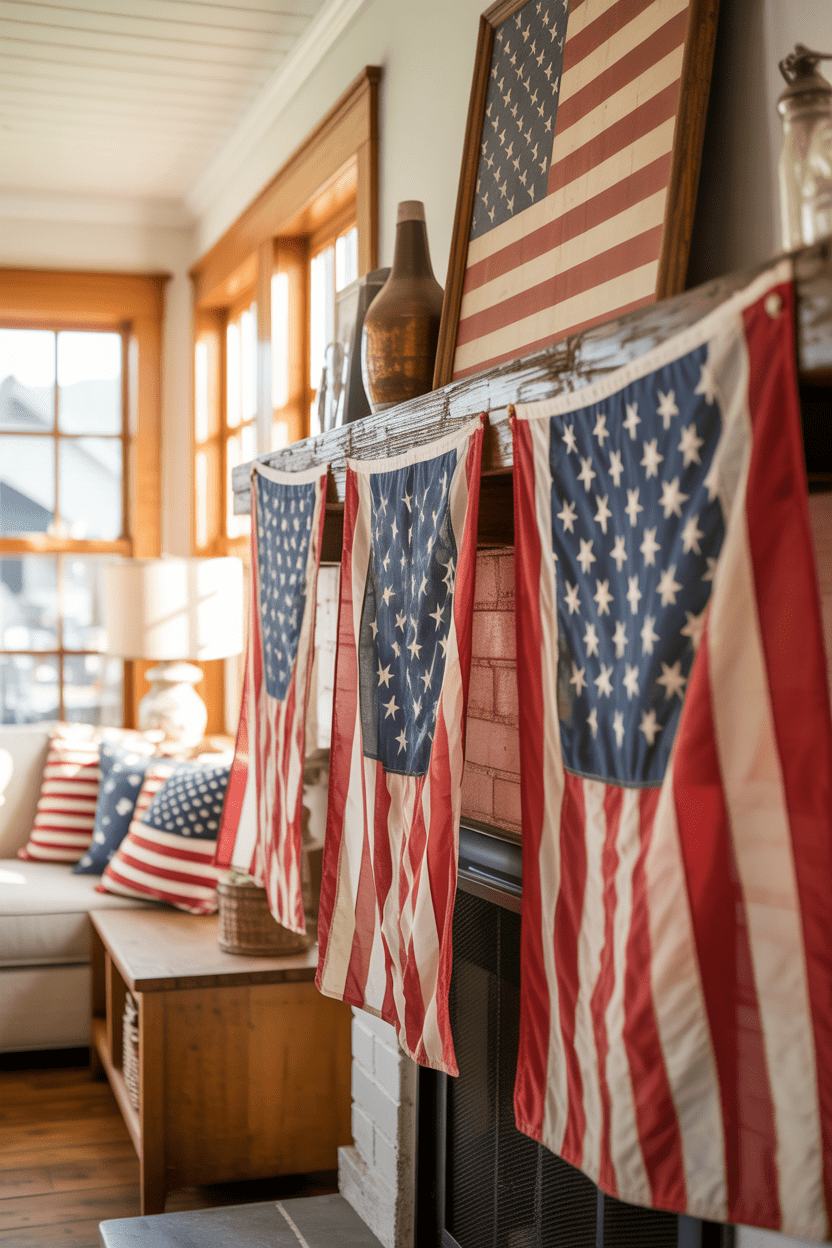 10. Vintage-inspired mantel with antique flags and Americana decor
