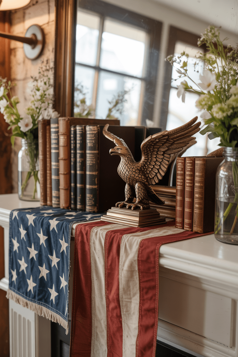 If you love a nostalgic vibe, a vintage-inspired patriotic mantel is the way to go. Use antique flags, old books, and vintage patriotic decorations to create a collected look. This style feels meaningful and full of history.
