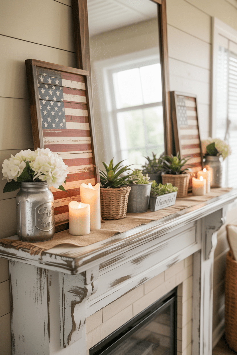 Farmhouse style wall decor pairs beautifully with patriotic mantel decor. I love using distressed wood signs with flag details for a relaxed, homey look. Layer them with simple decor pieces to keep everything feeling balanced.