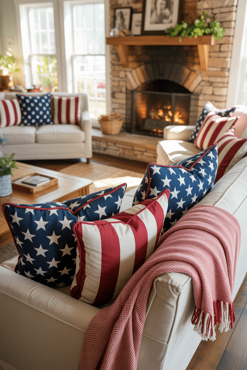 If you have seating near your fireplace, don’t forget to style it too. Adding Americana throw pillows or vintage patriotic flag pillows ties your entire patriotic living room decor together and makes the space feel cohesive.