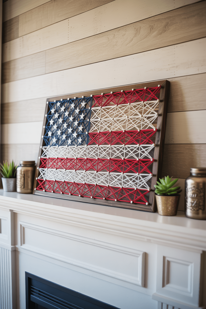 14. DIY patriotic string art as a mantel focal point