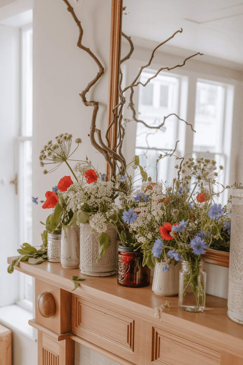16. Nature-inspired patriotic mantel with branches and wildflowers