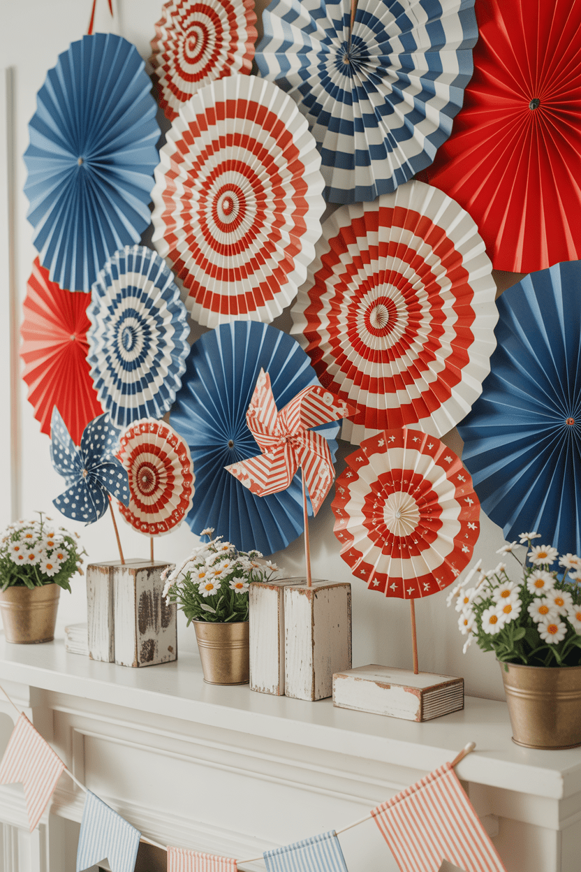Decorating with pinwheels and paper fans adds a fun, nostalgic vibe to your 4th of July mantel decor. I love mixing different sizes and patterns for a playful, vintage fourth of July aesthetic.