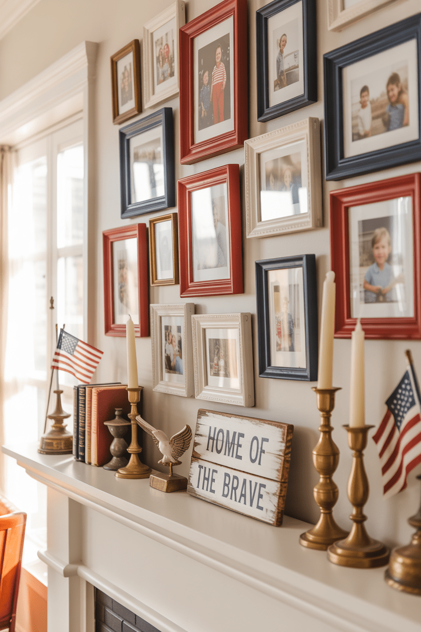 18. Family photo mantel with patriotic frames and keepsakes