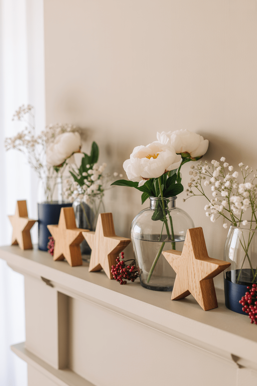 Sometimes less really is more. A simple fourth of July decor approach with small wooden stars and subtle red and blue accents can feel incredibly stylish. It’s perfect if you love a clean, uncluttered look.