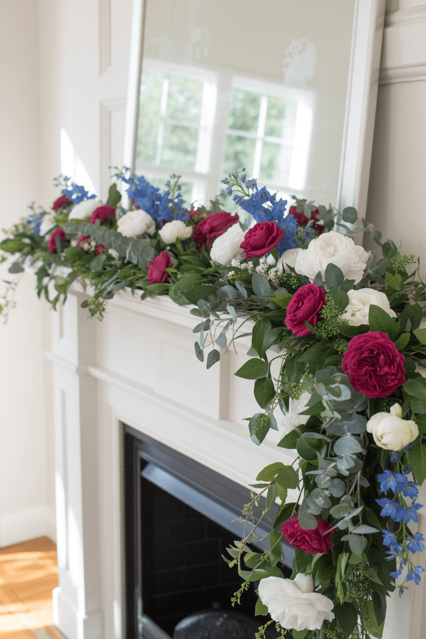2. Draped red, white, and blue summer mantel garland with greenery