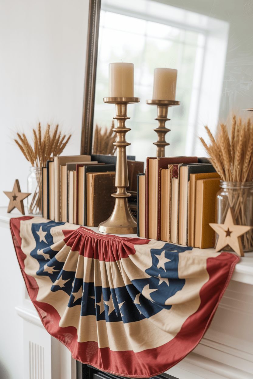 Layering an Americana banner across vintage books and candlesticks creates height and visual interest on your fourth of July mantel decor. I love how this mixes classic patriotic decor ideas with cozy, collected styling.