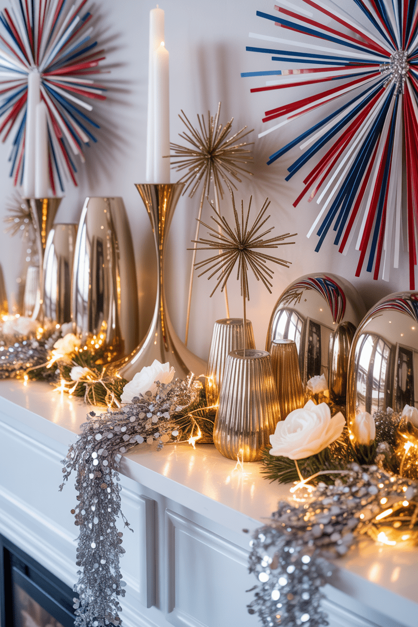 21. Firework-inspired mantel with metallic accents and sparkling decor