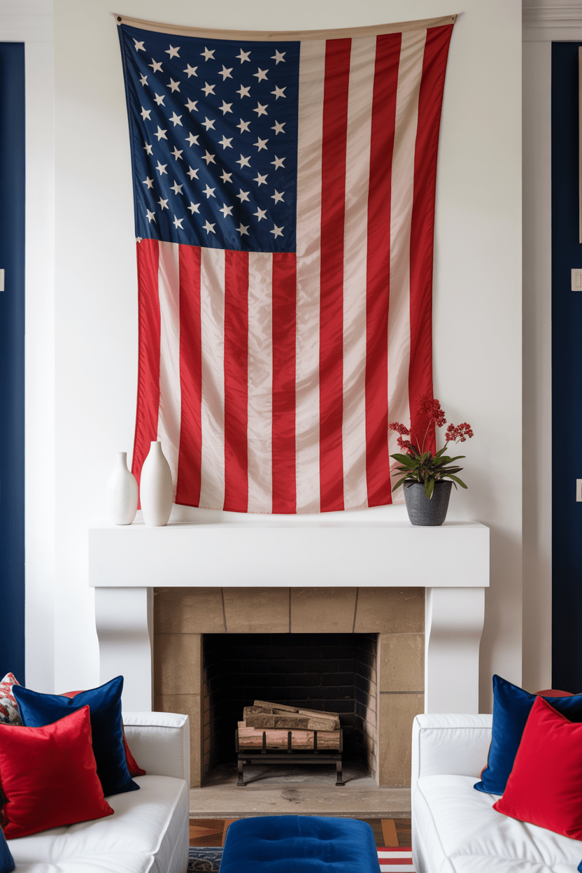 If you want a bold and eye-catching 4th of July decor idea, an oversized American flag behind the mantel is it. This creates instant impact and anchors your entire patriotic mantel decorating ideas setup. I recommend keeping the rest of your decor a bit simpler so the flag really shines.