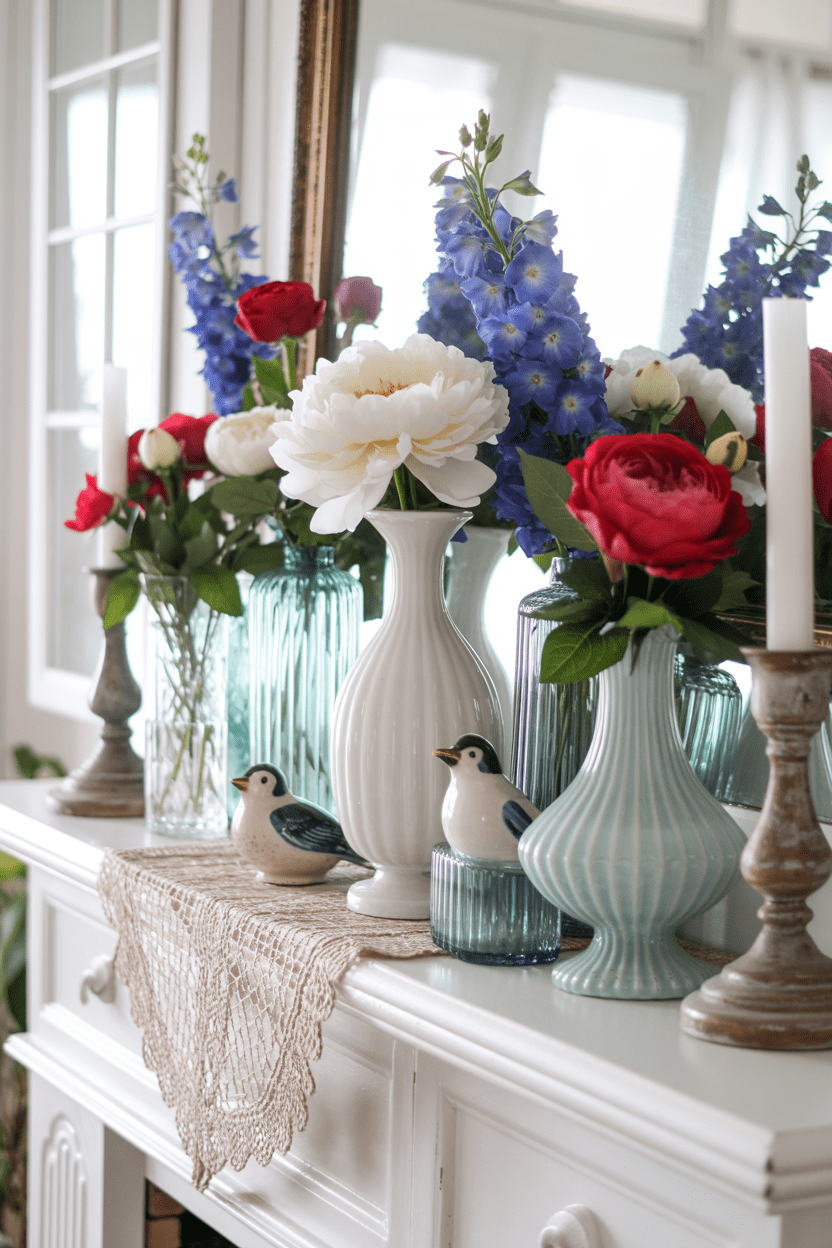 There’s something so pretty about using milk glass in 4th of July mantel decor. Fill vintage milk glass vases with red and blue flowers for a soft, elegant take on patriotic mantel decor. This idea feels light, airy, and perfect if you love a more refined, classy 4th of July style.