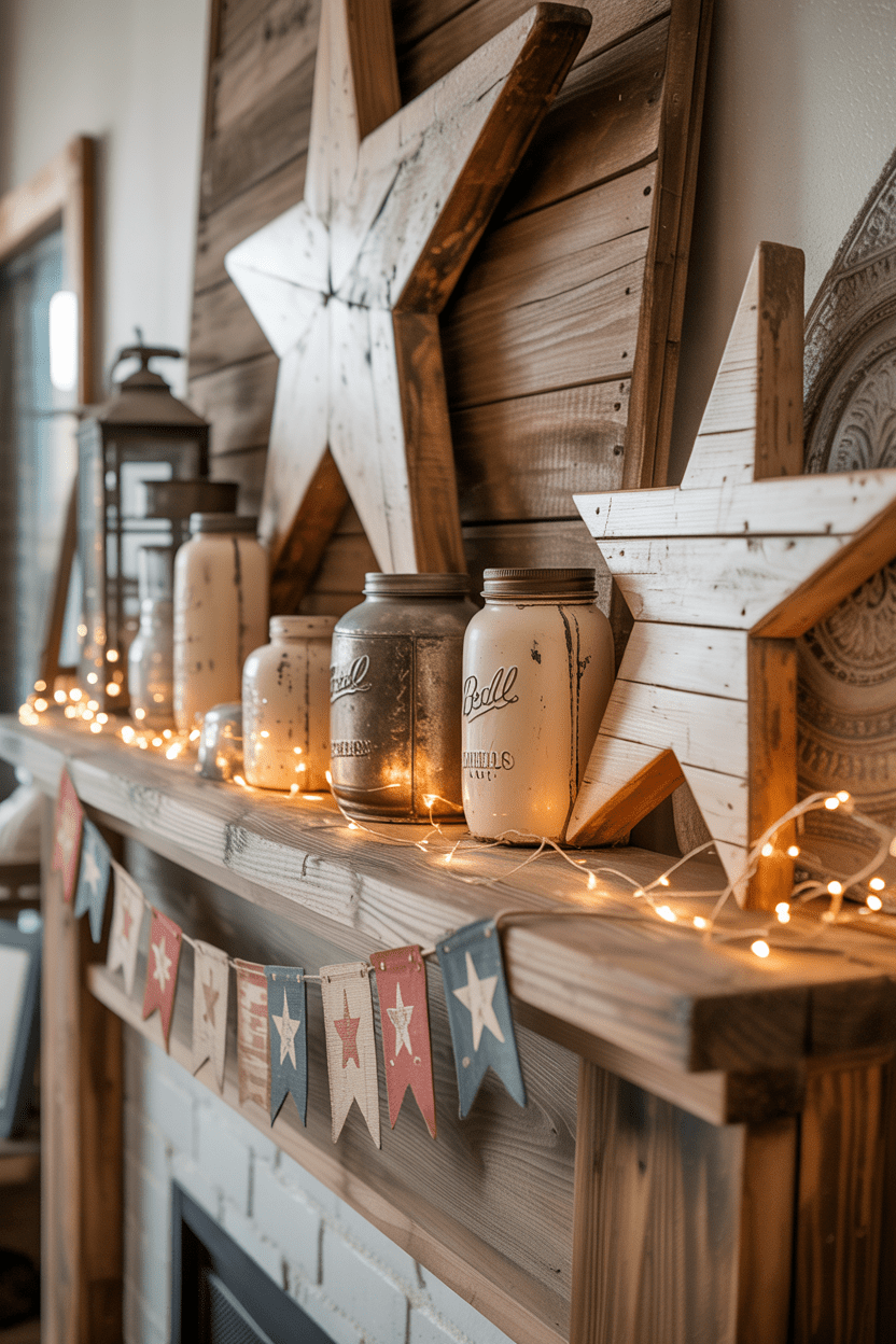5. Rustic Americana mantel with wooden stars and antique accents