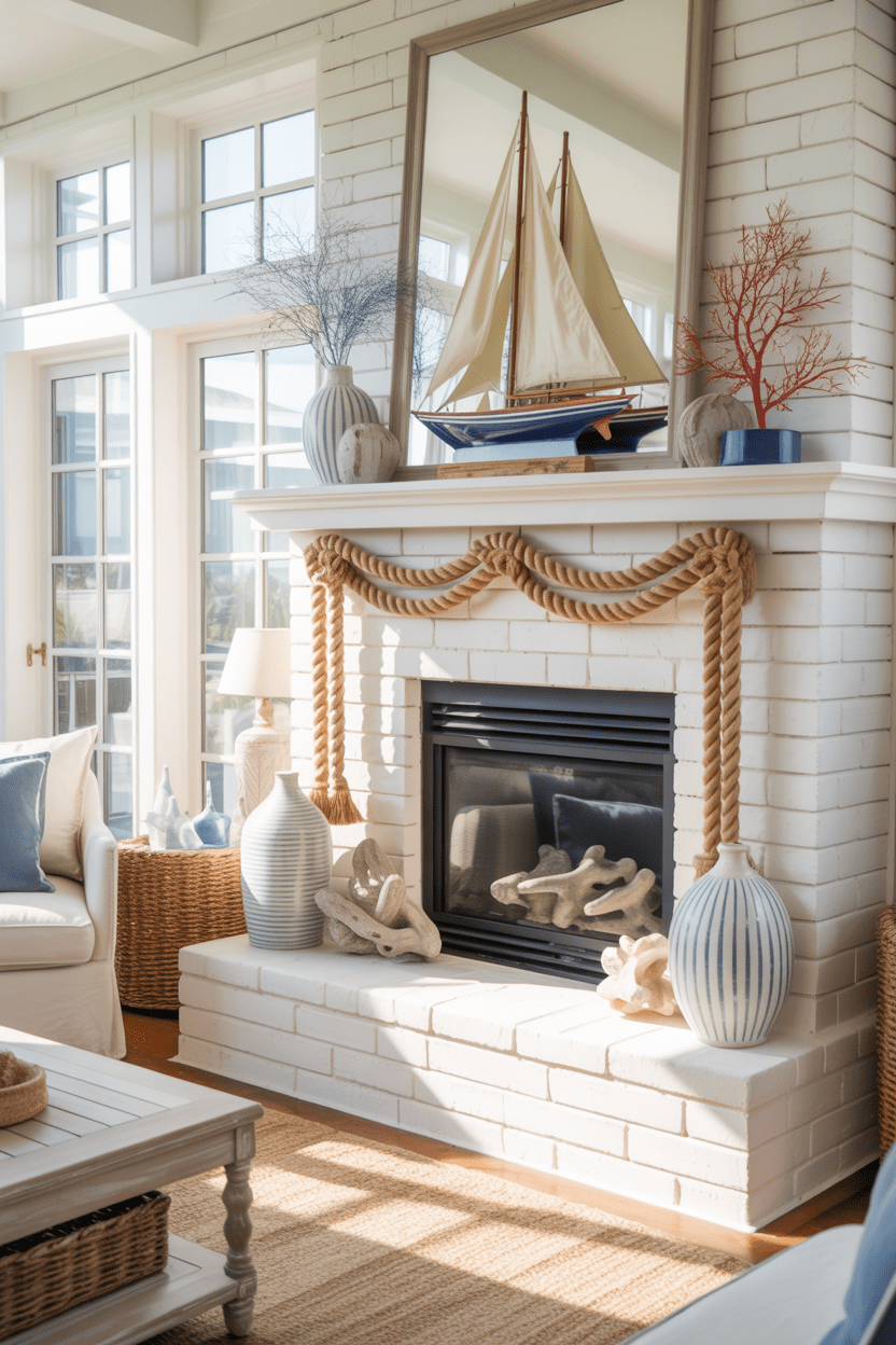 6. Coastal nautical 4th of July mantel with rope and sailboat decor