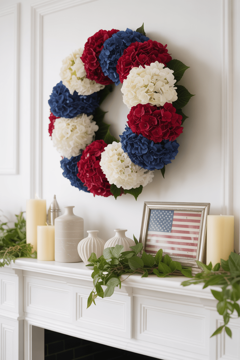 7. Patriotic hydrangea wreath centered above the mantel