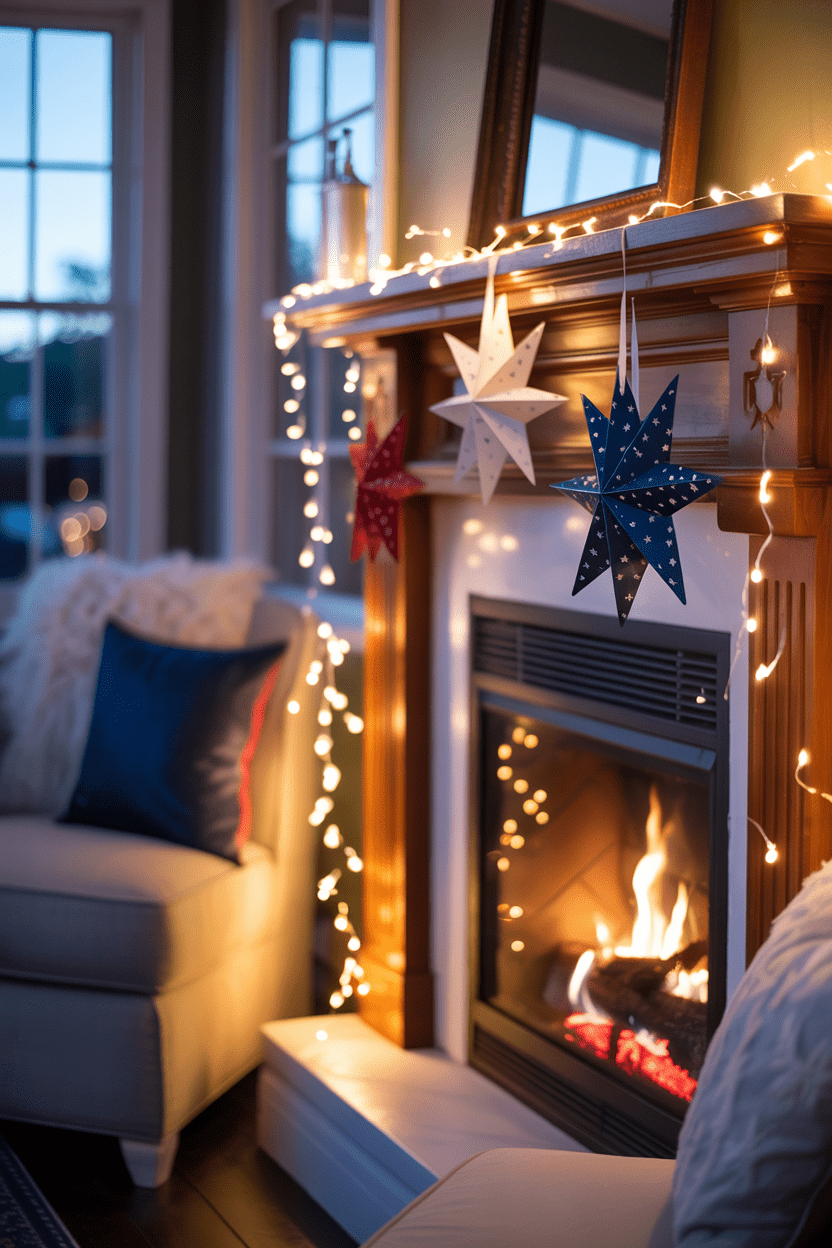 Adding string lights inside your mantel styling creates such a cozy, magical feel in the evening. Pair them with hanging stars for a layered patriotic mantel decorating ideas look. This setup works beautifully for summer nights and gatherings.