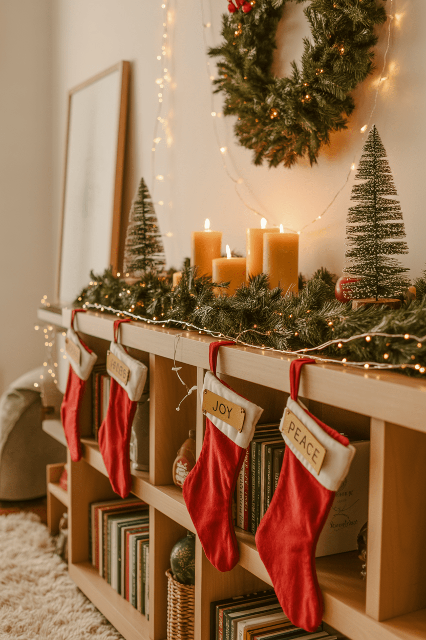 Shelves and walls are prime real estate for adding festive touches. Style your built-ins with mini trees, nutcracker figurines, or garland, and hanging wreaths or art on the walls. Christmas wall decor makes the room feel layered and extra cozy.