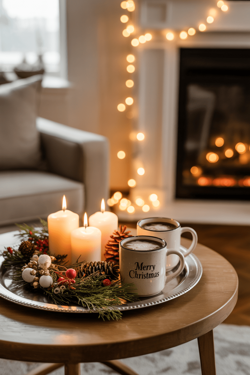 Your coffee table is the center of the living room, so don’t skip it. I love styling a tray with candles, ornaments, or a little greenery. Christmas coffee table decor ties everything together and makes the whole room feel thoughtfully styled.