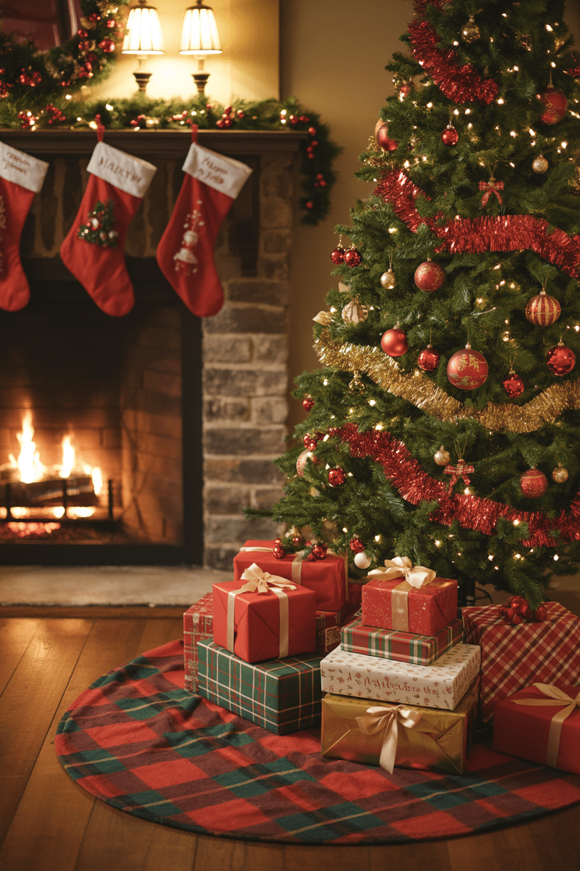 Sometimes you just can’t beat the classics. A traditional Christmas living room with a big green tree, plaid throws, nutcrackers, and red ribbons always feels warm and nostalgic. It’s perfect if you want your space to feel like a timeless holiday postcard.