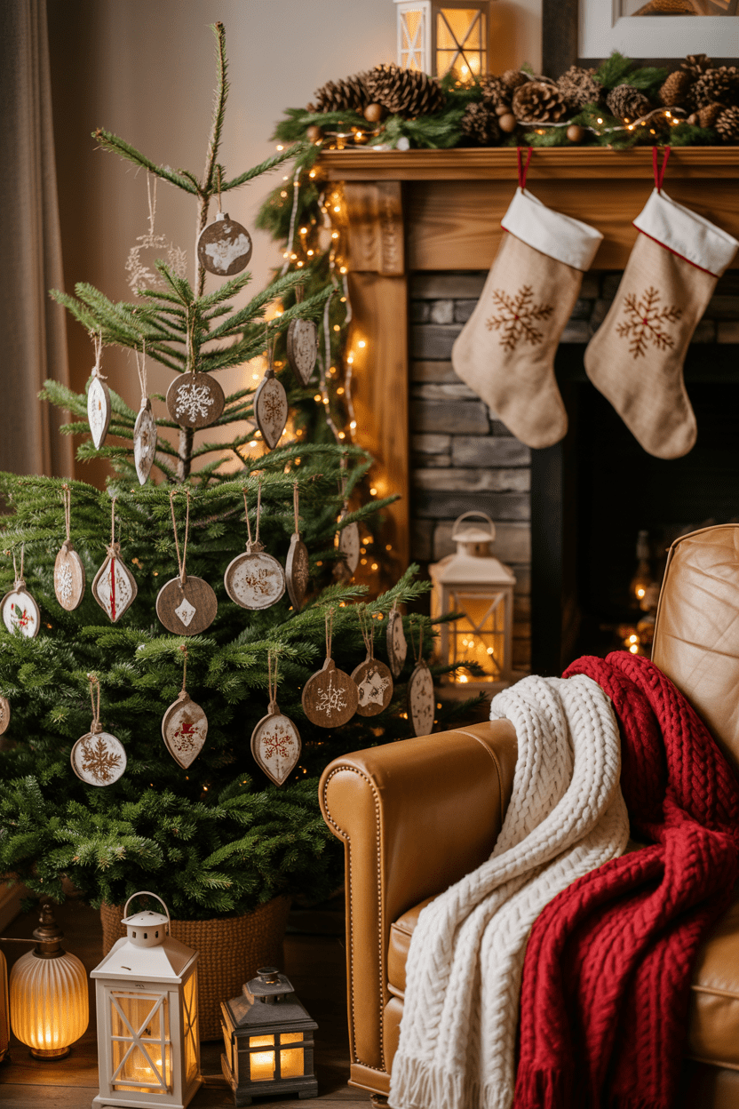 If you’re drawn to cozy, natural vibes, a rustic Christmas living room is a winner. Add pinecones, birch logs, lanterns, and handmade ornaments. It makes the space feel like a mountain cabin getaway.