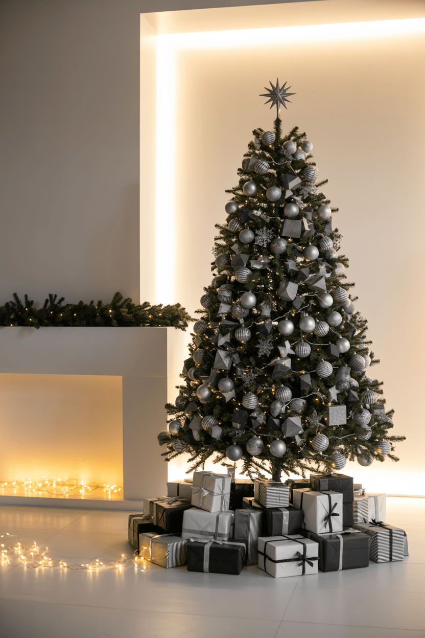 Sleek, minimal, and fresh—a modern Christmas living room is perfect if you love clean lines. Keep the tree simple with monochrome ornaments, black and white wrapped gifts beneath the tree, and add black-and-white accents for a trendy twist on holiday style.