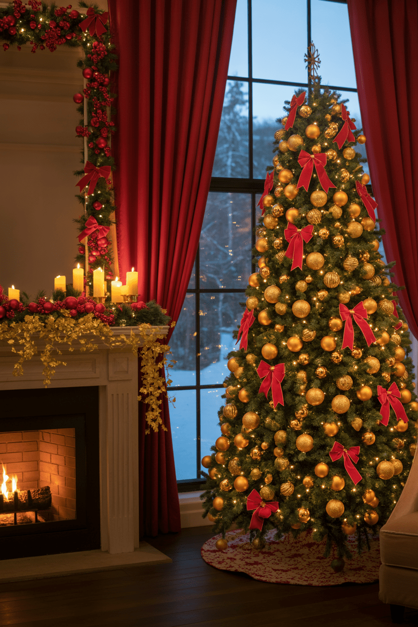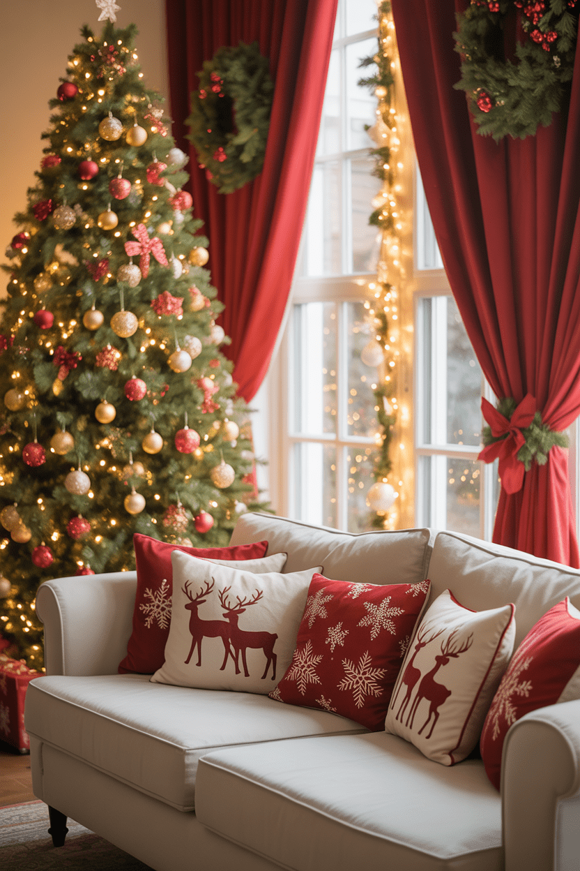 Red and gold is the ultimate classic—rich, warm, and oh-so festive. I enjoy layering in velvet pillows, gold ornaments, and a few statement ribbons for that elegant but cozy vibe. It’s one of those timeless Christmas living room ideas that always makes guests feel welcome.