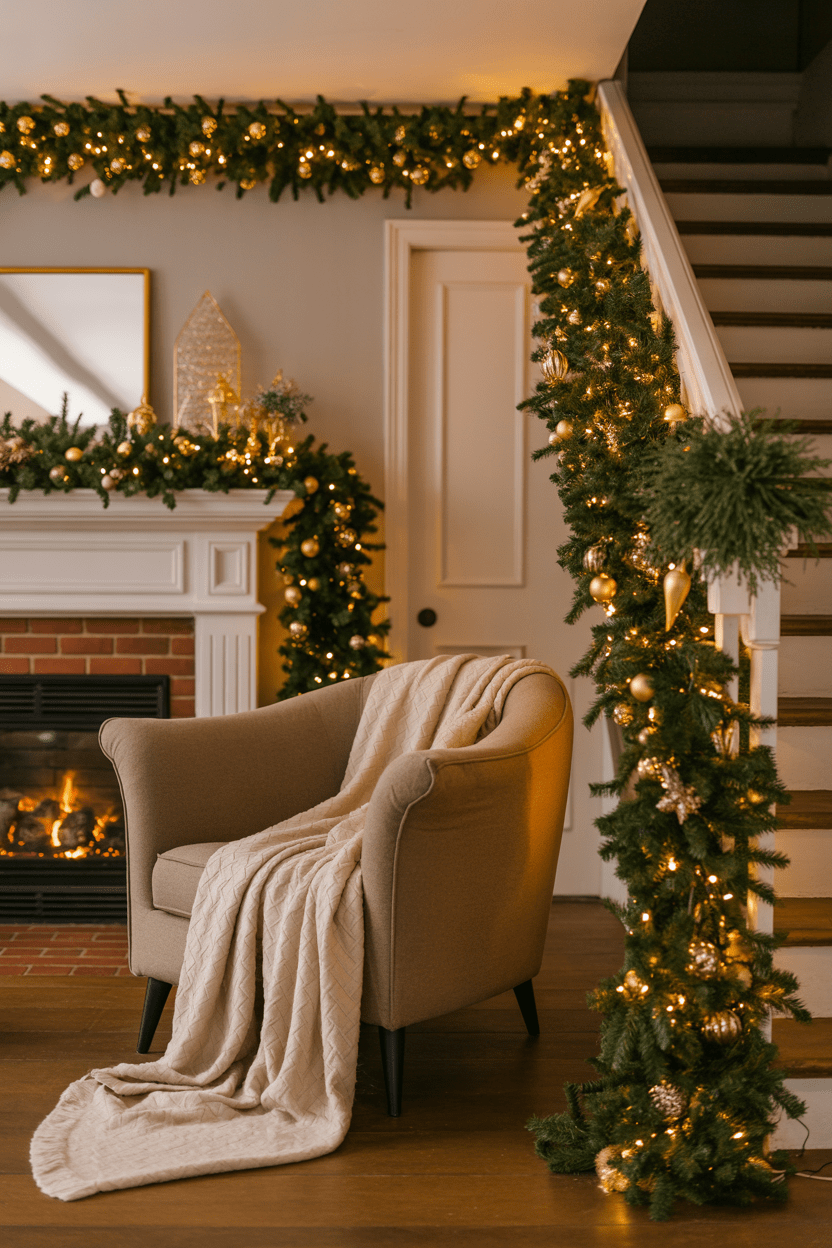 Garlands are so versatile. You can use them on the mantel, around mirrors, along stair rails, or even draped across shelving. A Christmas garland in the living room instantly makes the space feel lush and festive.