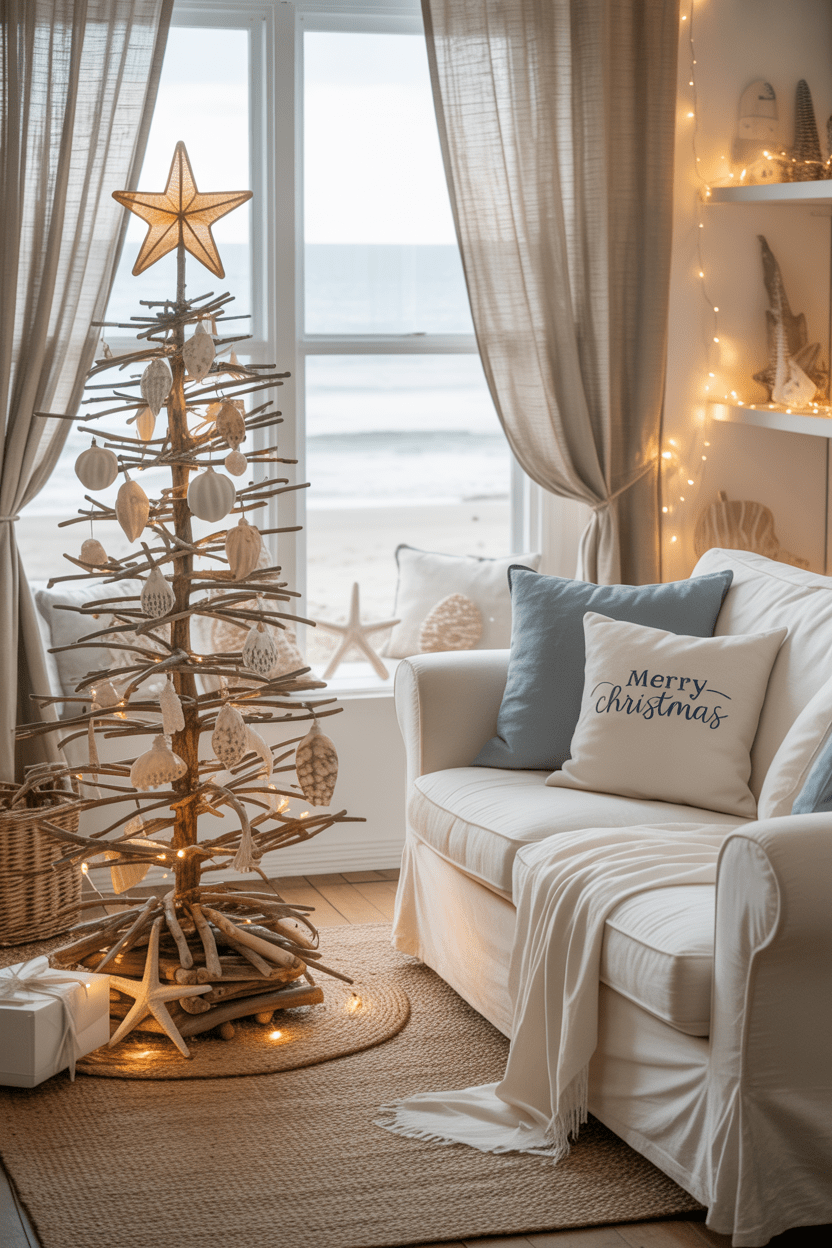 If you love a lighter look, a coastal Christmas living room is such a fun twist. Seashell ornaments, driftwood accents, and a palette of soft blues and whites bring that breezy, beachy vibe to the holidays.