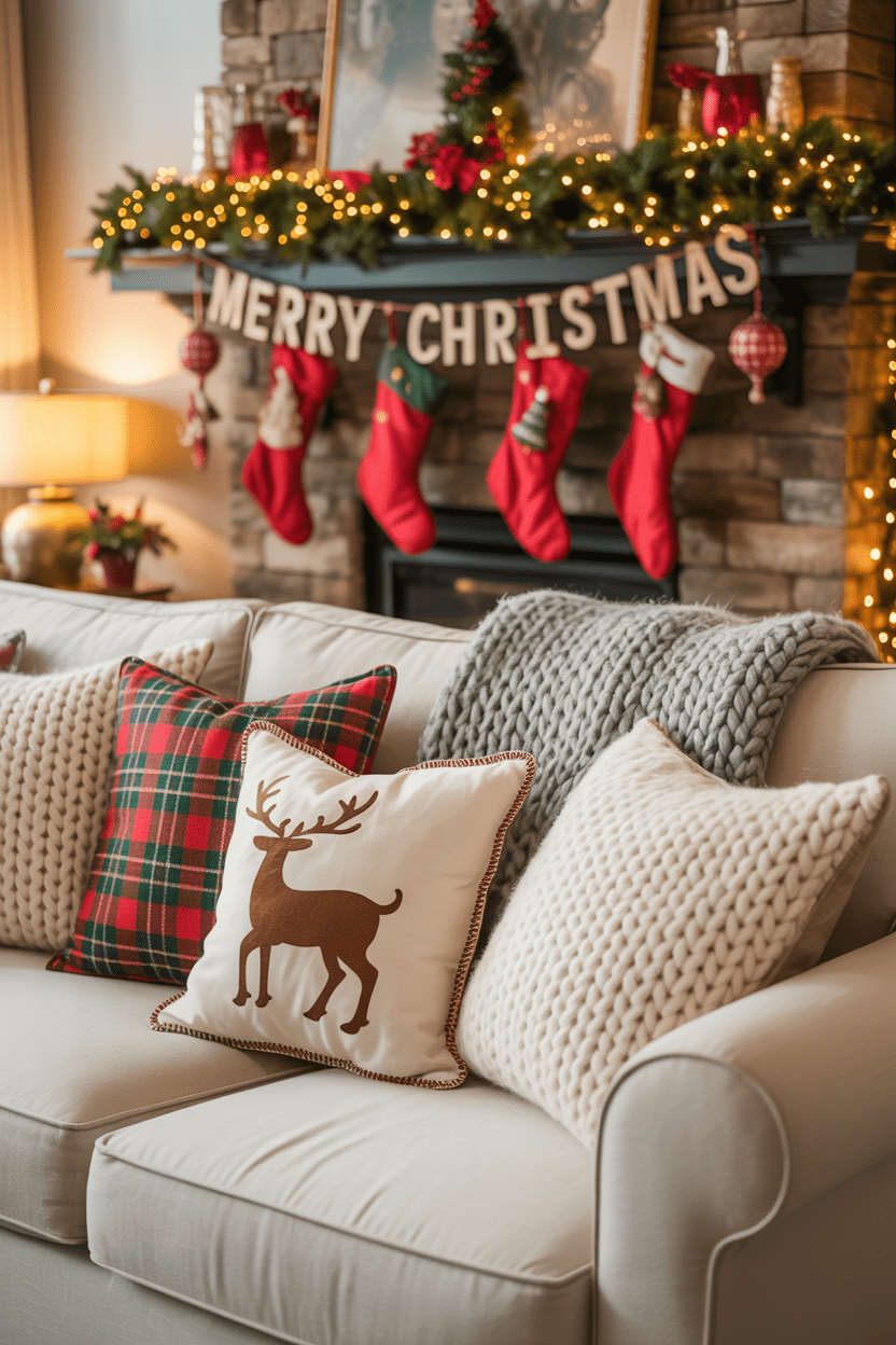 One of the easiest swaps for instant holiday charm is textiles. I always bring in cozy Christmas pillows, chunky knit throws, and a few festive slipcovers. They add warmth and texture without overwhelming the space.