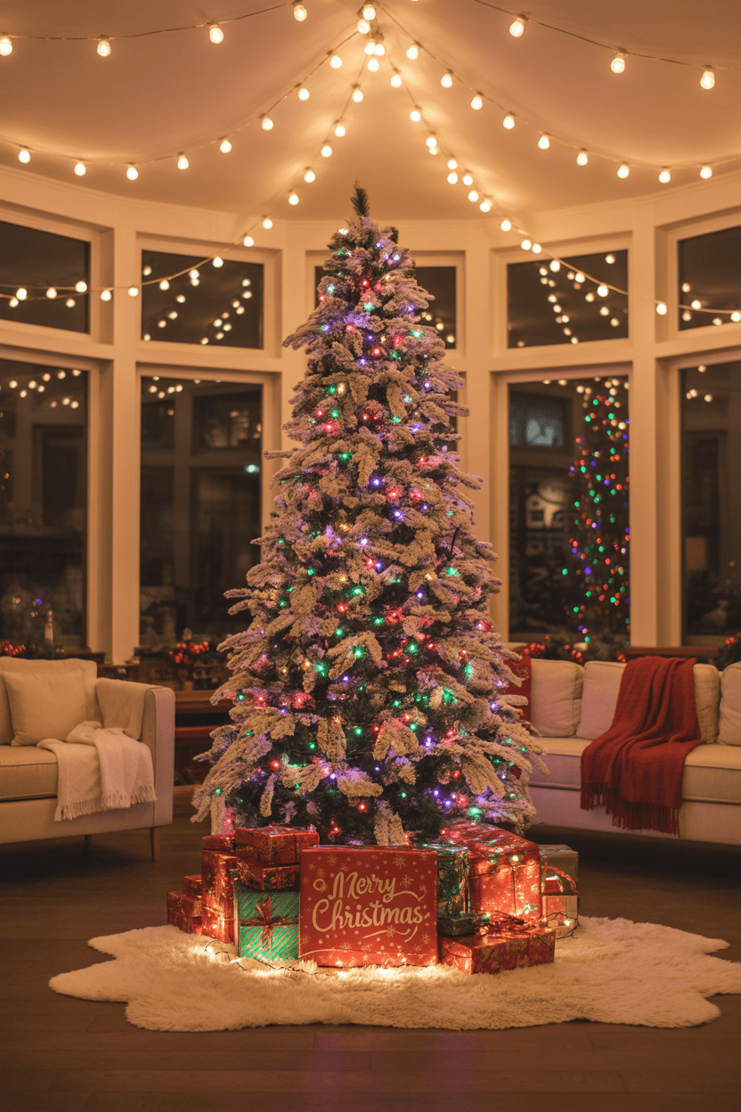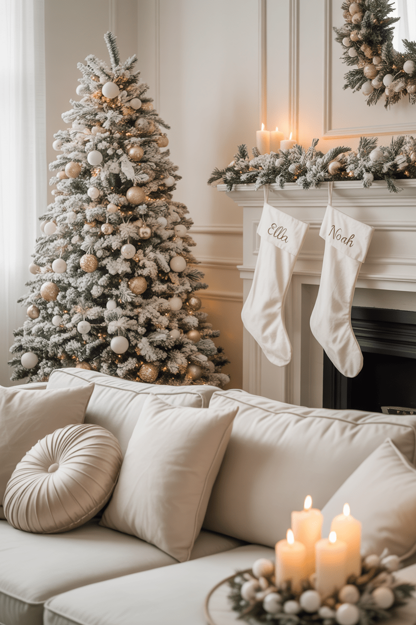 Turn your living room into a snowy escape with a winter wonderland theme. I love flocked Christmas trees, frosted garlands, and shimmering silver accents—they make the whole room feel magical. Add white throw pillows, faux fur blankets, and twinkling fairy lights to bring that snowy sparkle inside.