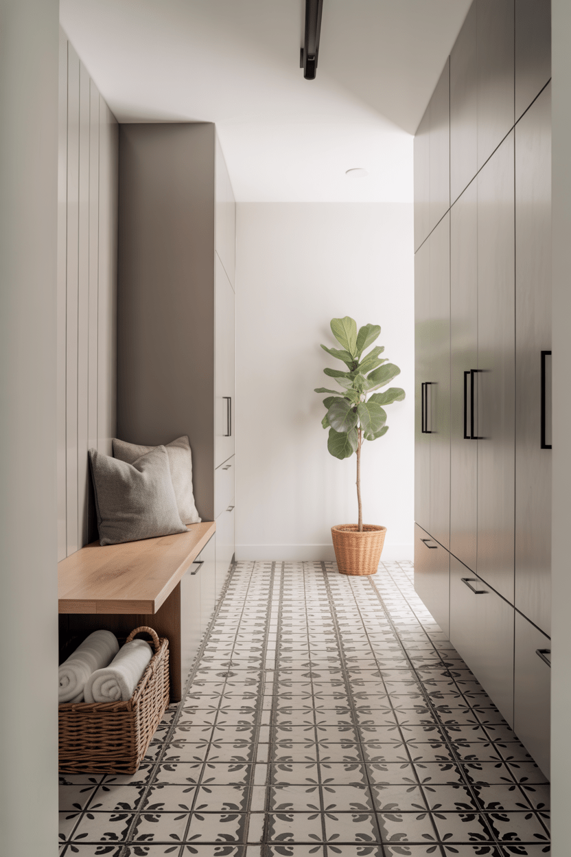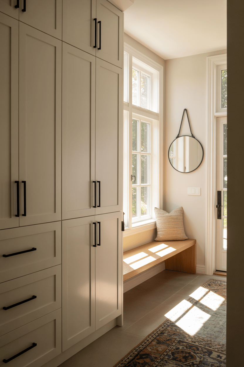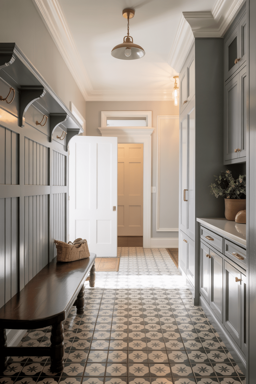 If you like a mix of styles, transitional mudroom design is the way to go. Combine sleek cabinetry with timeless details like wainscoting or patterned tile. It’s a look that feels fresh yet classic, and it works in almost any type of home.