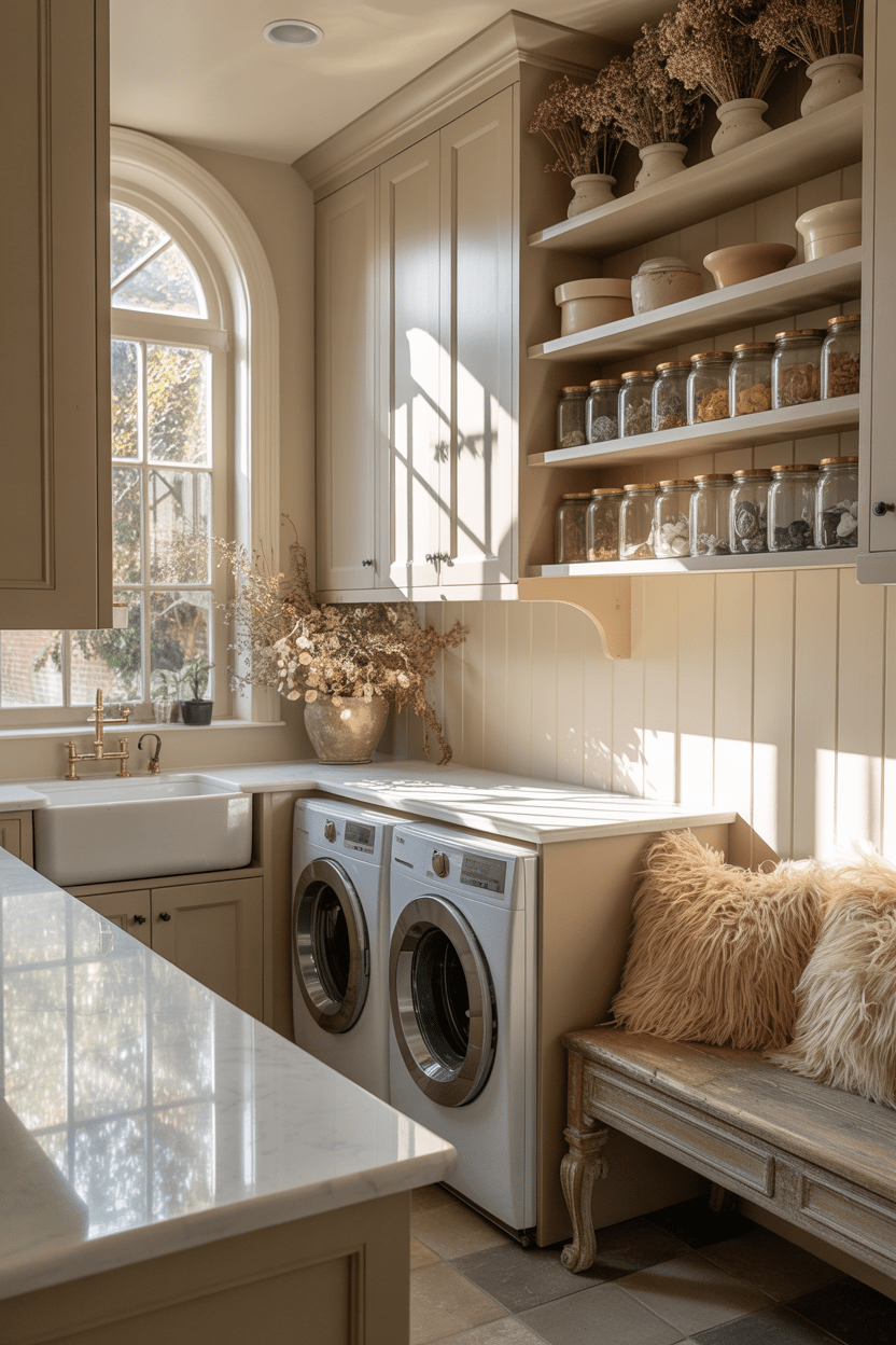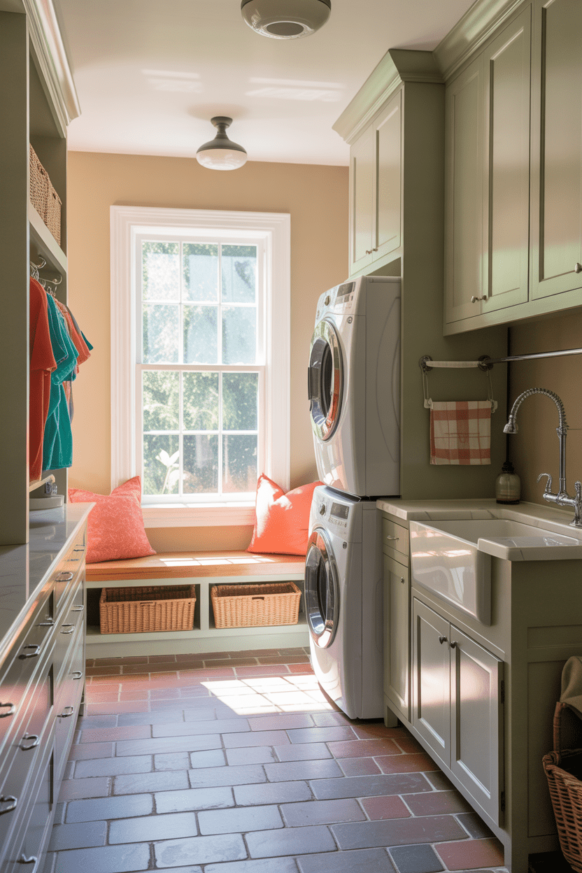 I’m a big fan of multitasking spaces, and combining your laundry room and mudroom is one of the smartest design choices you can make. Stack laundry appliances alongside built-in storage, and you’ll have a hardworking space that keeps chores centralized.