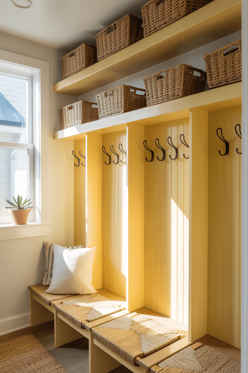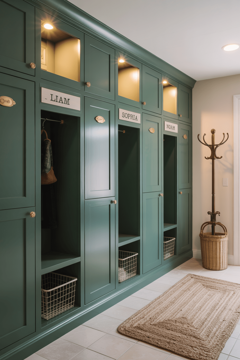 Lockers aren’t just for school—they’re perfect for mudrooms too. Built-in lockers give every family member a dedicated spot for their things. Add baskets or bins inside for shoes and accessories, and you’ll never hear the dreaded “Where’s my backpack?” again.