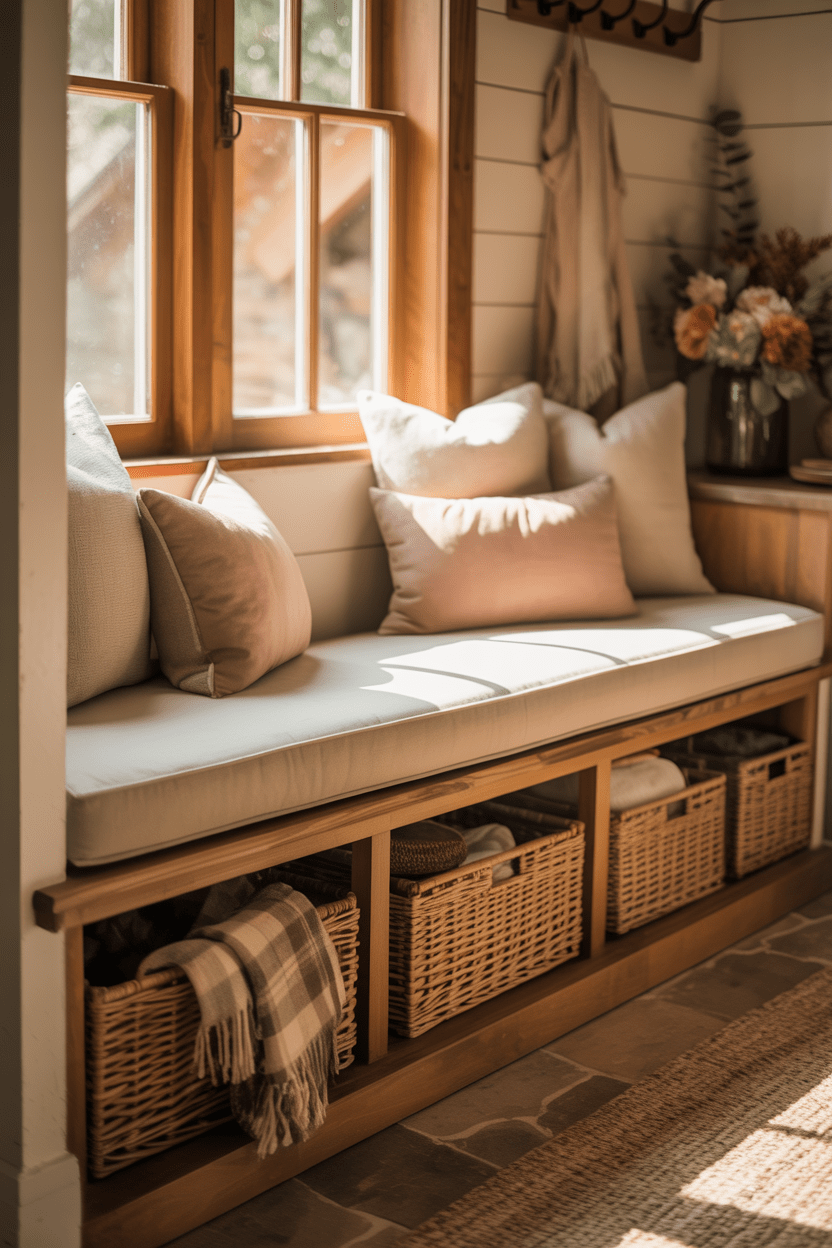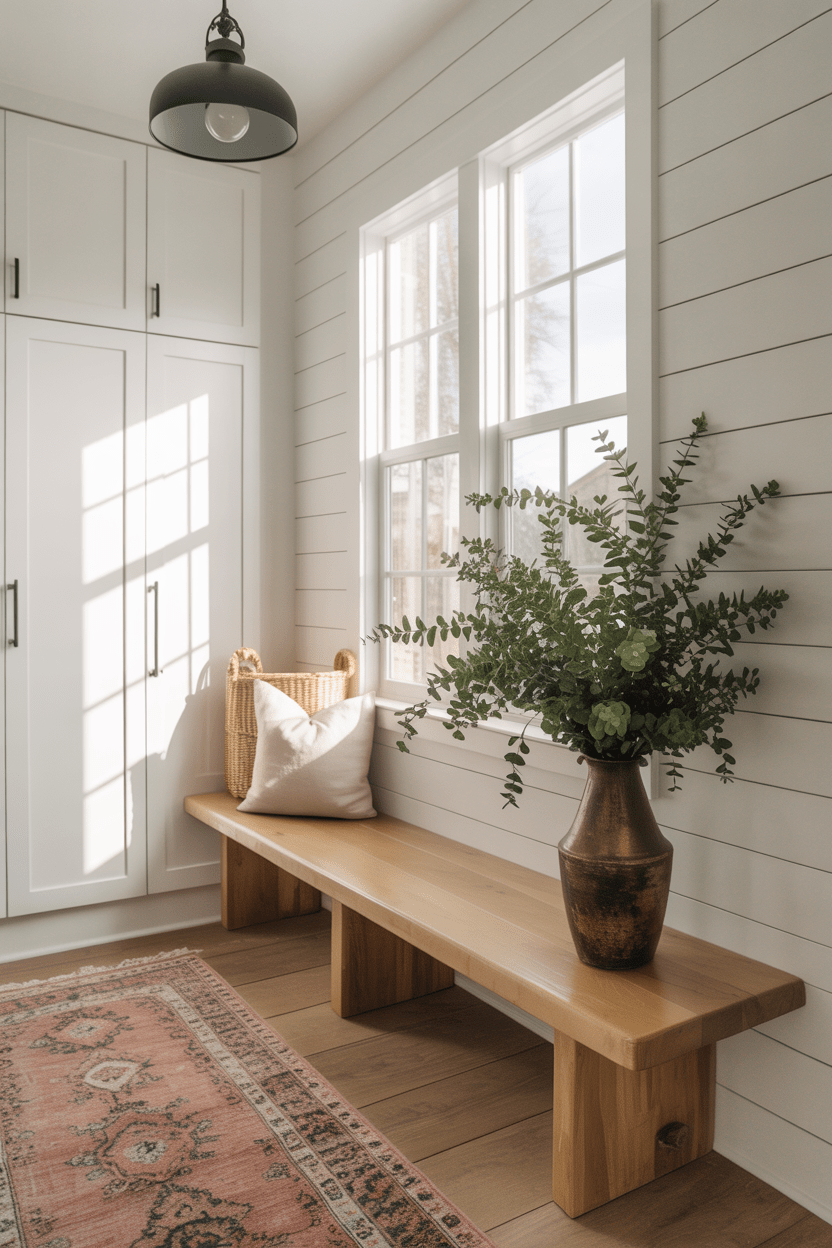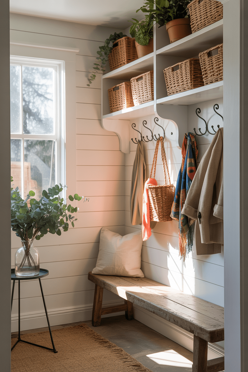 Farmhouse mudroom design will always have my heart. Reclaimed wood benches, shiplap walls, and vintage-style hooks create a warm, inviting space. Add woven baskets or wire bins for storage, and you’ll have a mudroom that feels charming and family-friendly.