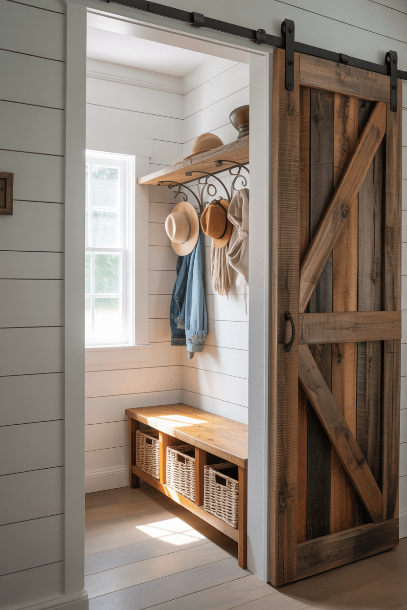 Sliding barn doors are such a clever solution for small mudrooms. They save space compared to swinging doors and add a rustic farmhouse vibe at the same time. They’re especially great if your mudroom opens right into a hallway or kitchen.
