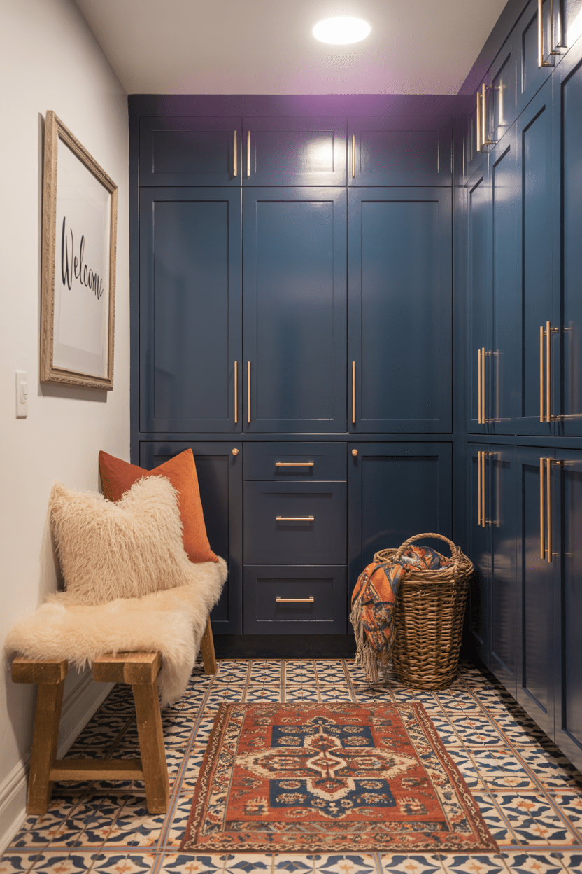 One of my favorite ways to liven up a mudroom is with colorful cabinets. Deep navy, forest green, or even a dusty blush can make the whole space pop. Since mudrooms are often smaller, this is the perfect place to experiment with a bold accent.