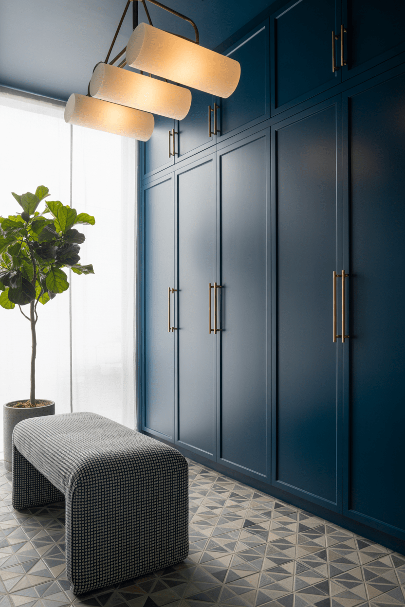 For something a little more striking, go with a modern contemporary mudroom design. Bold cabinet colors, geometric tile, and statement lighting instantly give the space personality. It’s practical, yes, but it’s also a chance to show off your style.