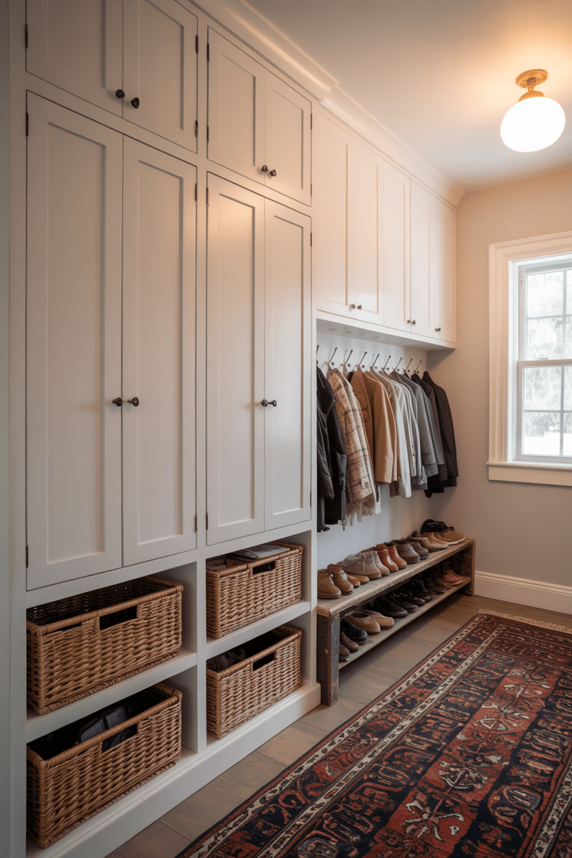 If you’re craving order, a dedicated mudroom closet design is the ultimate solution. Install full-height closets with pull-out baskets, labeled bins, and hanging space for jackets and shoes. Everything has a place, and you can close the doors for an instant tidy-up.