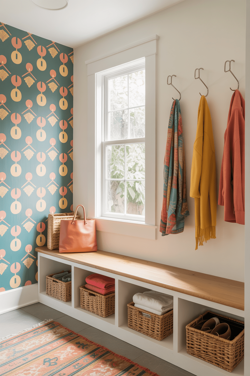 Wallpaper isn’t just for living rooms or bedrooms—it works beautifully in mudrooms too. A playful print or subtle texture can add so much personality. Keep it to one wall or just the back of built-ins so it enhances without overwhelming the space.